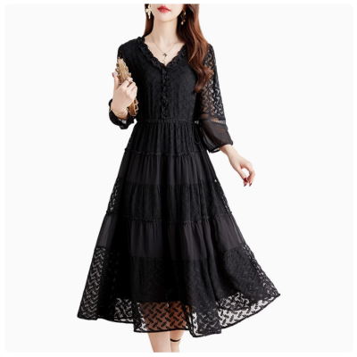 2025新款黑色真丝连衣裙女装今年夏季时尚流行重工刺绣桑蚕丝裙子